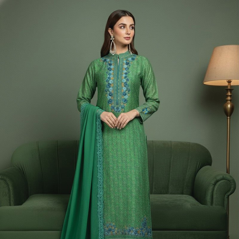 Lira is a timeless green silk semi-formal dress designed for effortless elegance. Crafted from premium silk fabric, this outfit features refined embroidery on the neckline and front panel, enhanced with subtle detailing along the hem. The rich green tone adds a graceful charm, making it ideal for semi-formal gatherings and elegant day events.
