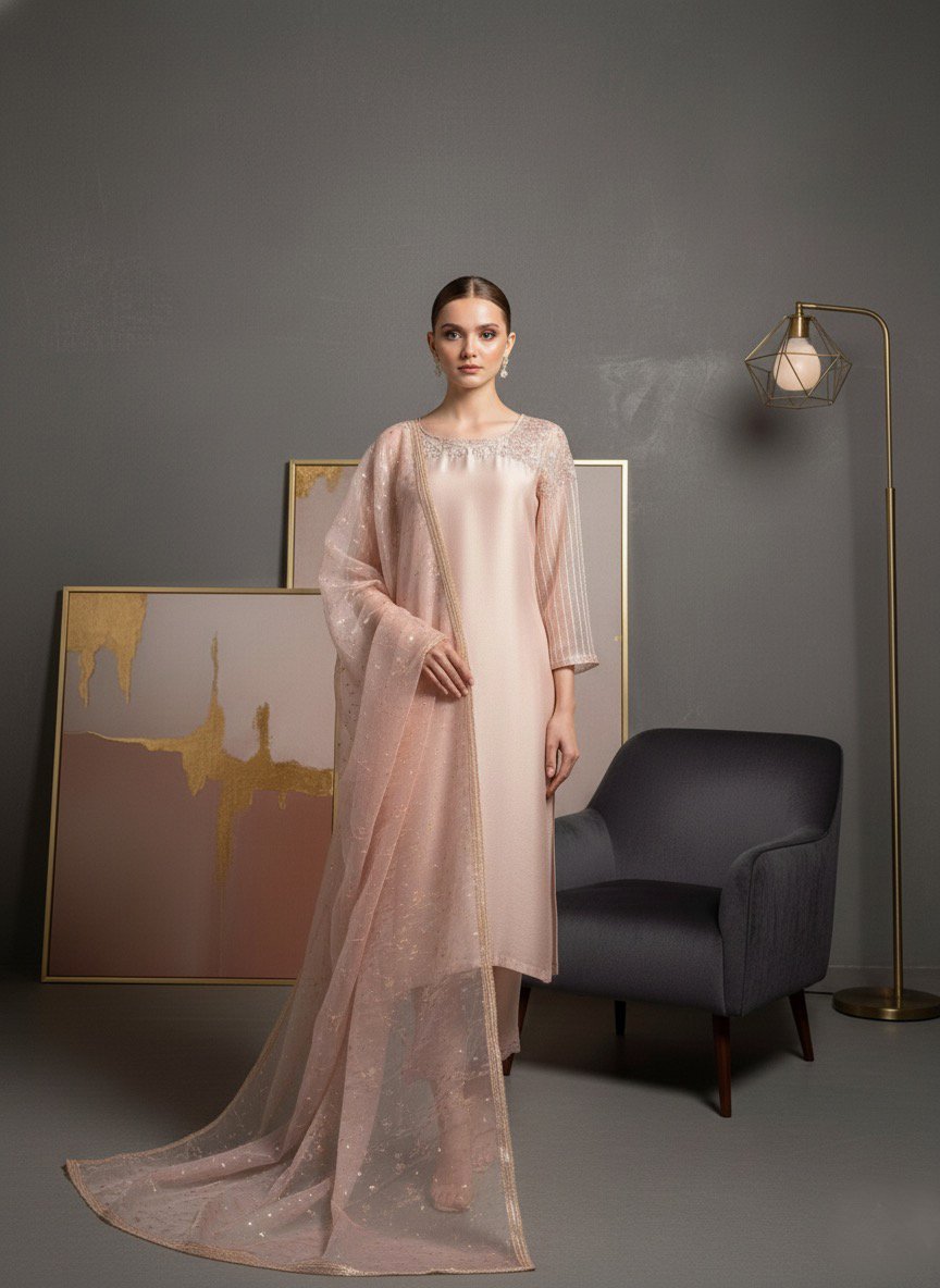 The Nysa ensemble is the epitome of delicate sophistication, designed for the modern woman who appreciates subtle luxury. Crafted from premium blush pink silk, this outfit features intricate silver and tonal hand-embroidery that elegantly accents the neckline and sheer sleeves.